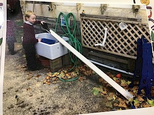 Harry is exploring by pouring water on the ramps, he used different containers and watched the volume of water flow.