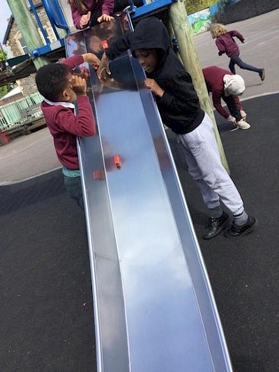 Harry is exploring by pouring water on the ramps, he used different containers and watched the volume of water flow.